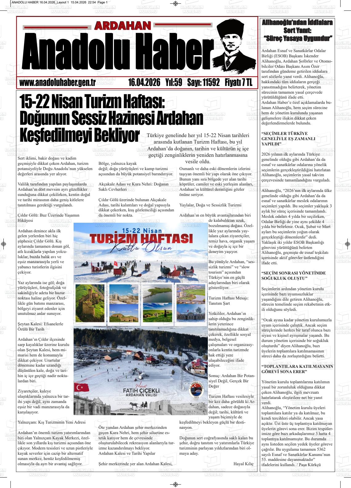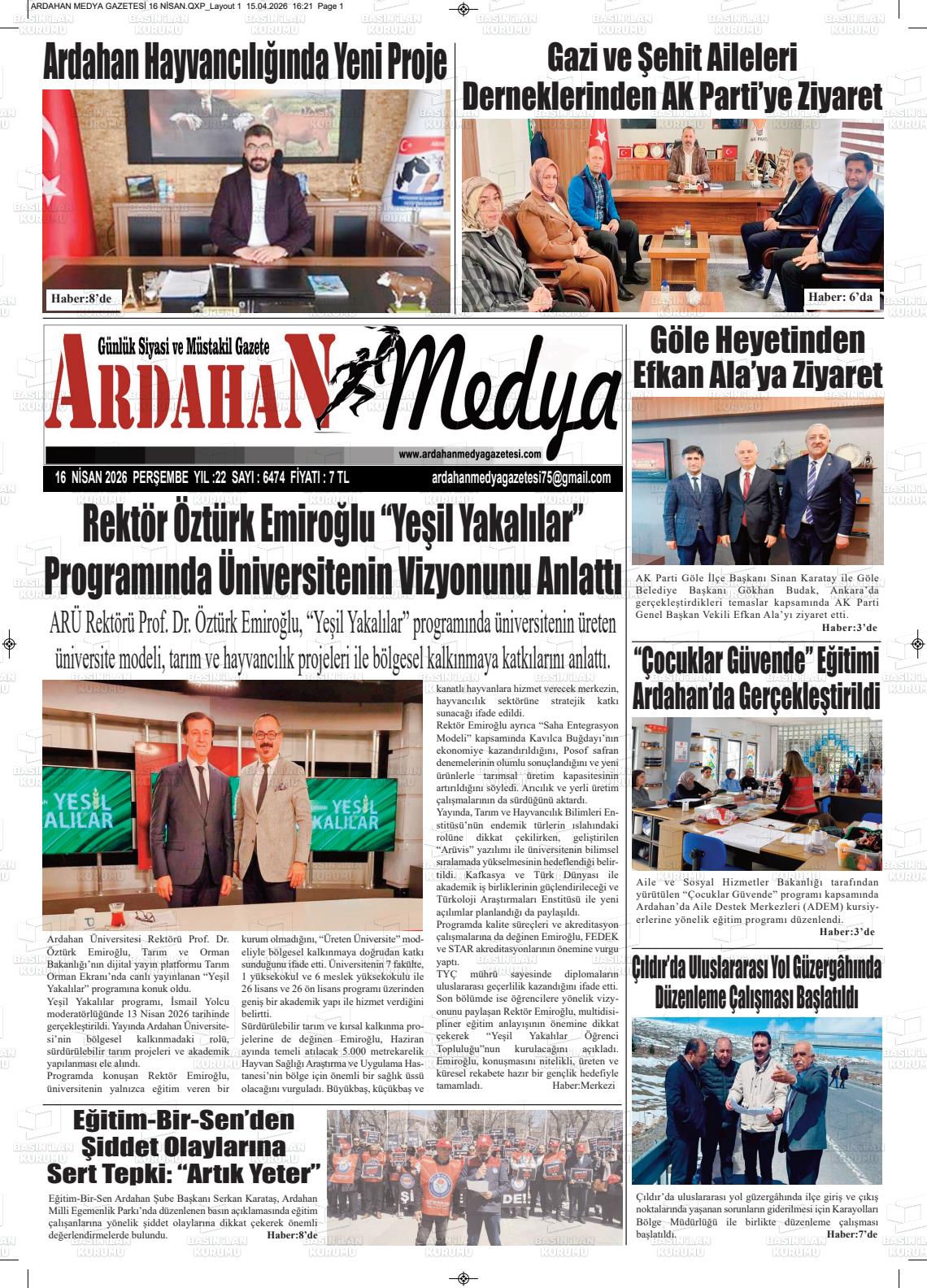 Ardahan Yerel Gazeteleri 16 Nisan 2026, Perşembe Günü Manşeti